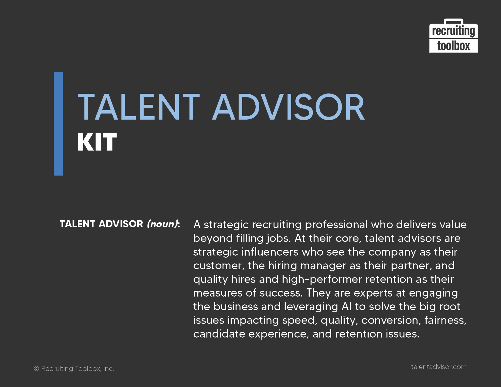 How do you know if you and your team operate as Talent Advisors today? How is the role of recruiter evolving from transactional to Talent Advisor, to something beyond? What are the career paths for recruiters in a world of AI and automation? Our team here at Recruiting Toolbox is engaged by world-class companies to help elevate their recruiters to Talent Advisors, and as part of our work, we assess how effectively recruiters engage and influence hiring managers. Use this kit – as a recruiter or TA leader – to think through how the role of recruiter needs to show up inside your organization.