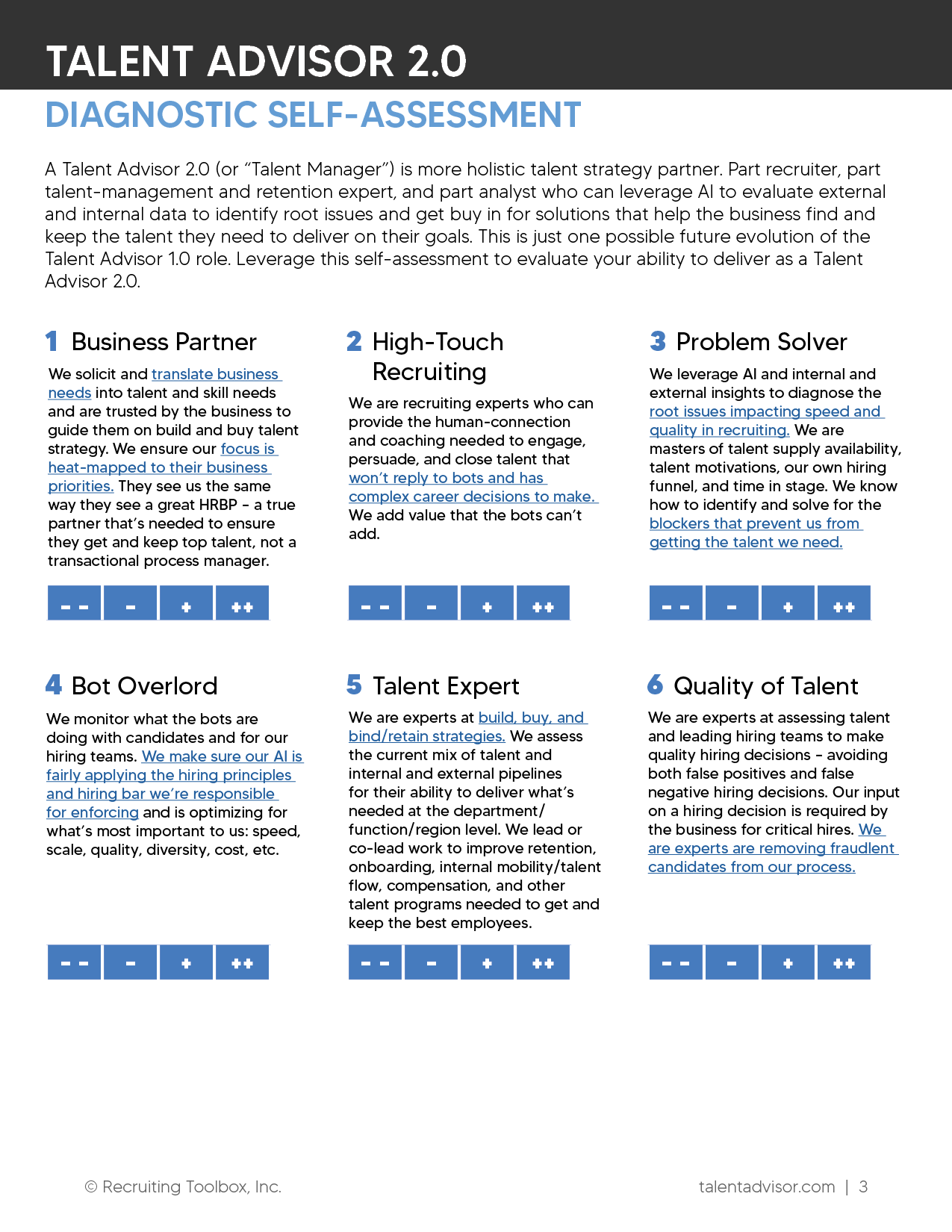 How do you know if you and your recruiting colleagues are operating as Talent Advisors? Our team here at Recruiting Toolbox is engaged by world-class companies to help elevate their recruiters to Talent Advisors, and as part of our work, we assess how effectively recruiters engage and influence hiring managers. Leverage what we’ve learned to self-assess your capabilities with these free diagnostic guides – one uses the lens of today’s Talent Advisor, and the other uses the more future focused Talent Advisor 2.0/Talent Manager role, which is part recruiter, part talent management expert.