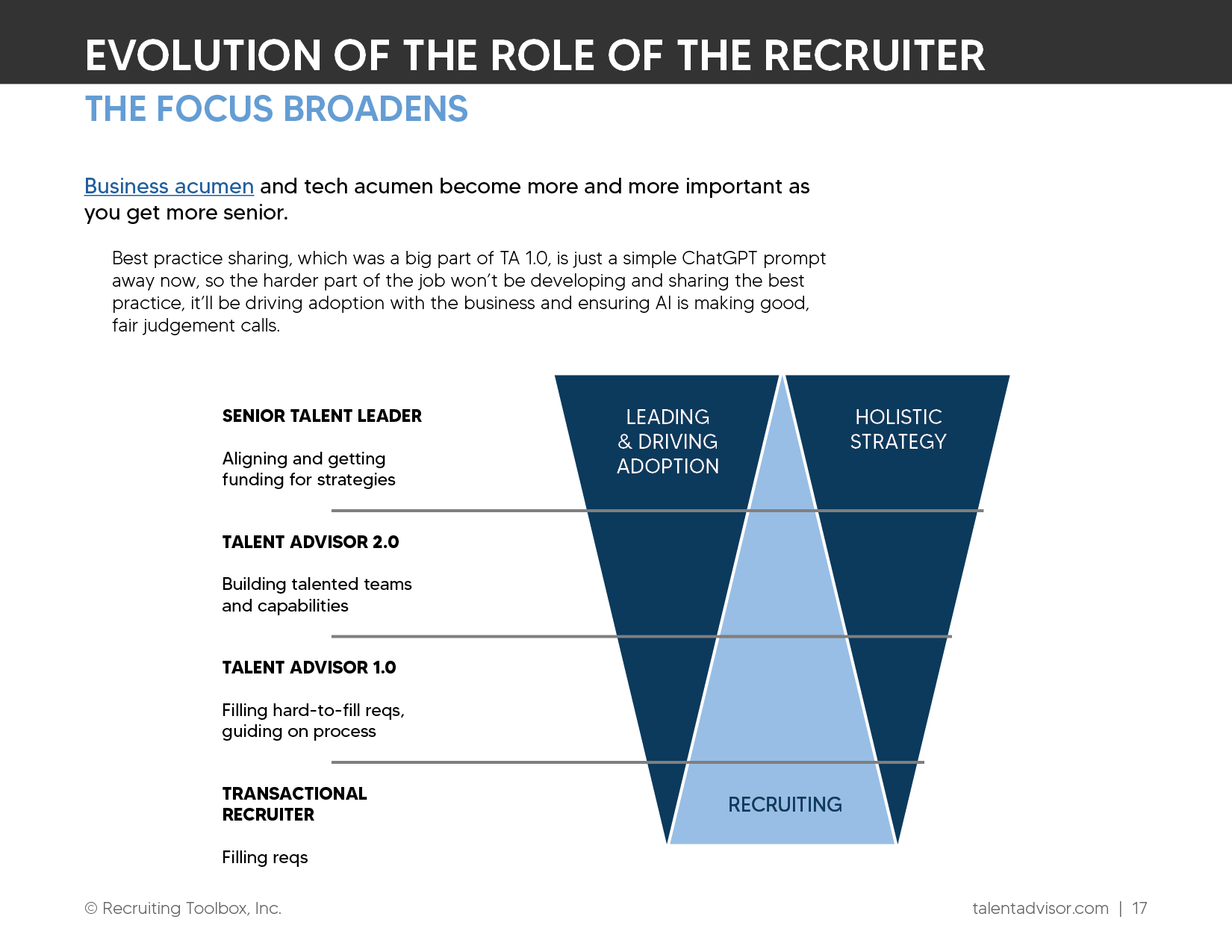At Recruiting Toolbox, we’ve listened to execs and hiring managers at hundreds of companies in 20+ countries, and almost ALL of them want their recruiters to step up and play more of a Talent Advisor role. With AI and automation poised to take over almost all of the transactional work of recruiters, it’s critical – for your own career and your ability to impact the business – that you and your recruiting teams are on the path to talent advising.