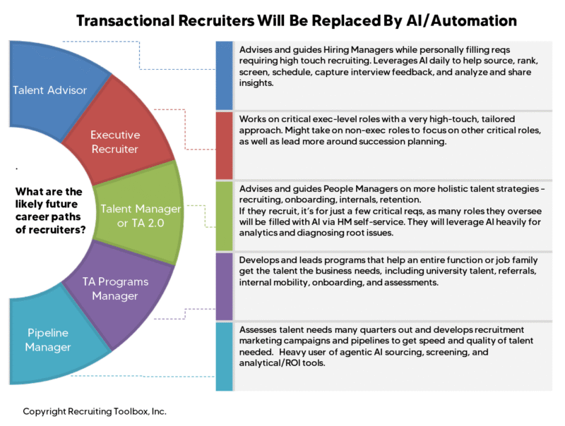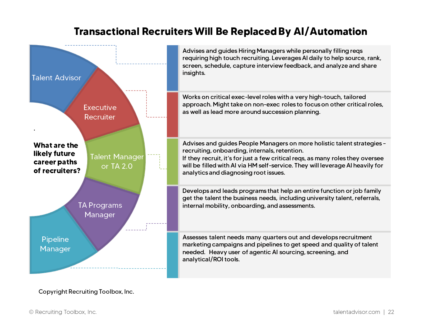 | Medium risk of being replaced by RPO or AI, but we may employ way fewer of them than in the past (recruiters we employ will be Talent Advisor 1.0 or 2.0 in the future — no more transactional recruiters) |