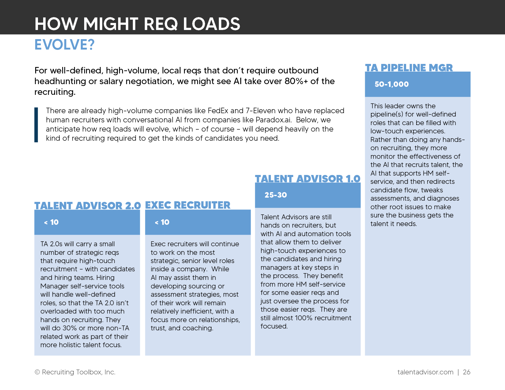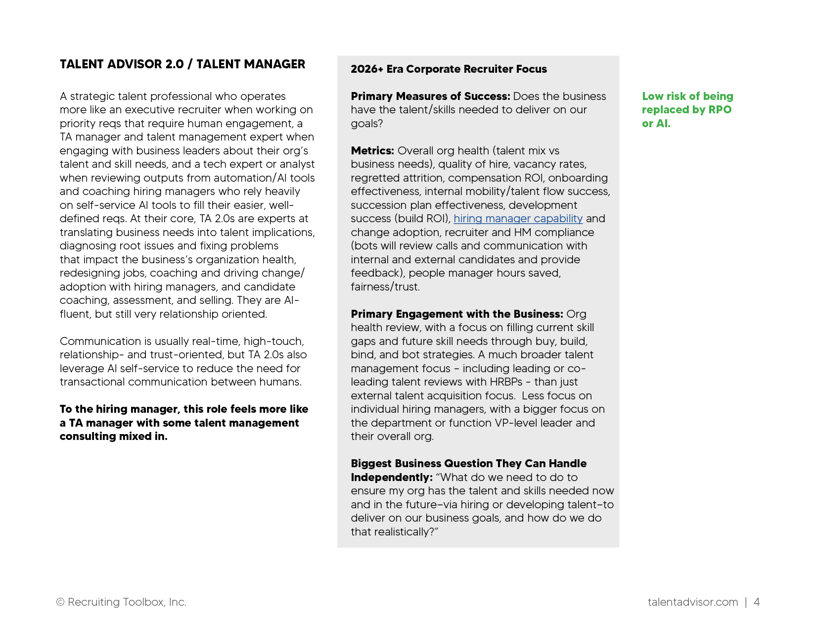 | TALENT ADVISOR 2.0 / TALENT MANAGER: A strategic talent professional who operates more like an executive recruiter when working on priority reqs, a TA manager and talent management expert when engaging with business leaders about their org’s talent and skill needs, and a tech expert or analyst when reviewing outputs from automation/AI tools and coaching hiring managers who rely heavily on self-service AI tools to fill their easier, well-defined reqs. At their core, TA 2.0s are experts at translating business needs into talent implications, diagnosing root issues and fixing problems that impact the business’s organization health, redesigning jobs, coaching and driving change/adoption with hiring managers, and candidate coaching, assessment, and selling. They are AI-fluent, but still very relationship oriented.