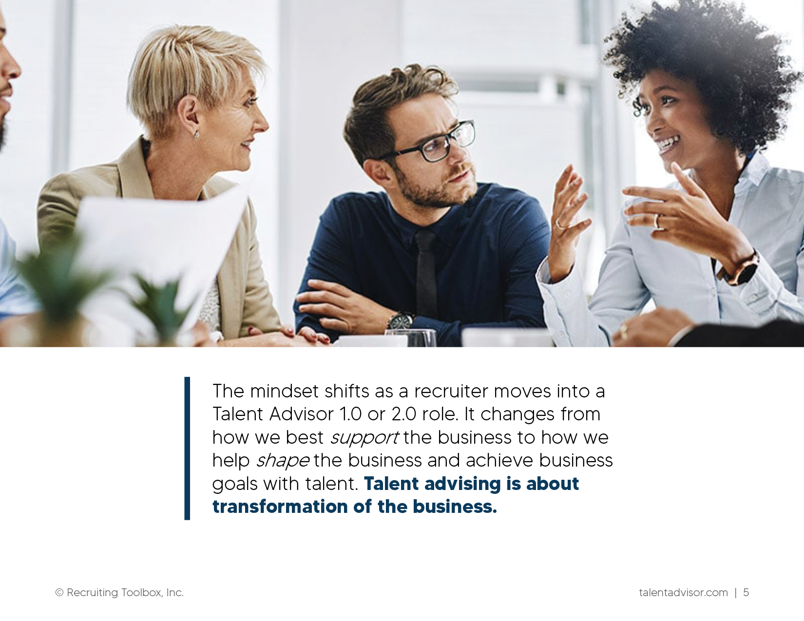 | TALENT ADVISOR 1.0: A strategic recruiting professional who delivers value beyond filling jobs. At their core, talent advisors are business-aligned, strategic influencers who see the company as their customer, the hiring manager as their partner, and speed, quality, and fairness as their measures of success.